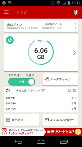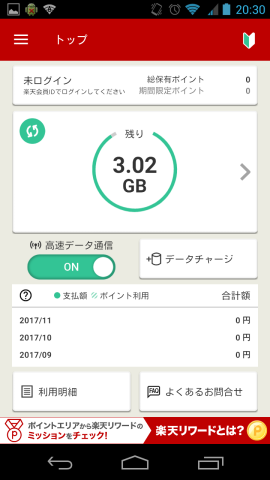 データ容量の残量確認は、楽天モバイルアプリで確認できます。
