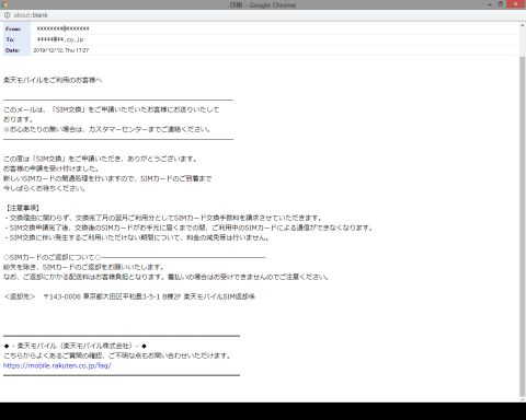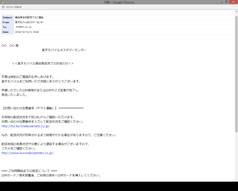 同日19時過ぎに、SIMの発送連絡がメールで届き、