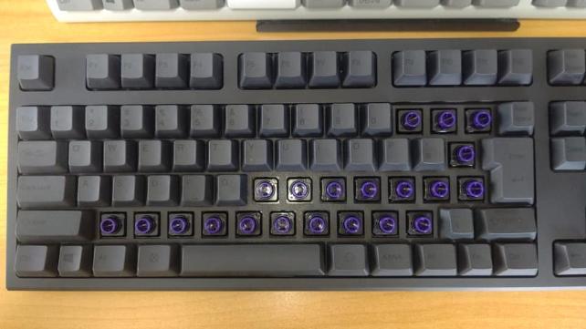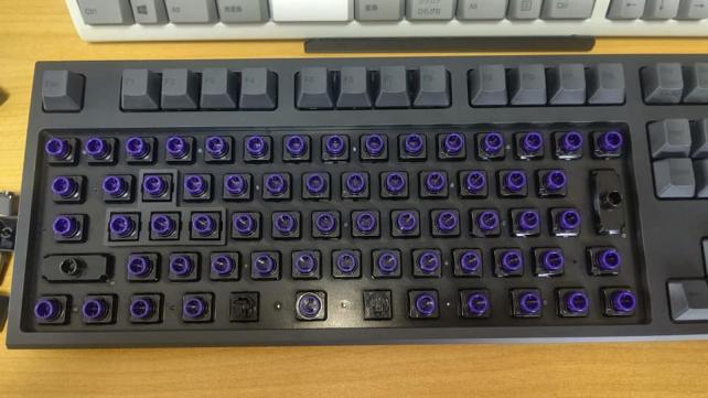 あとはスペーサーを入れてからキーキャップを取り付けていくだけです。 ちなみに殆どのブランジャが紫色となっているのは『静音スイッチ』である証です。