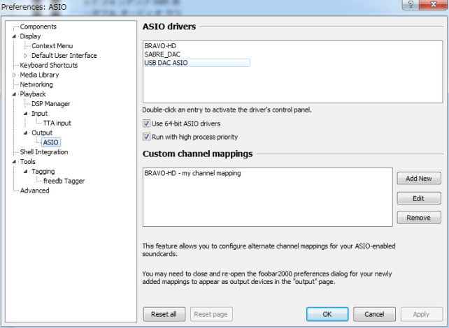 『ASIO:USB DAC ASIO』の項を選択してApply→OKとクリックします。