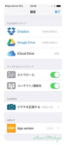 上から「Cloudのドライブ」で利用出来るクラウドサービスのログイン情報の設定、「バックアップ」する内容の設定(カメラロールと連絡先しか出来ません)、メニュー内でカメラを起動するメニューがありその時のビデオ解像度の設定、アプリケーションのバージョン情報になります。