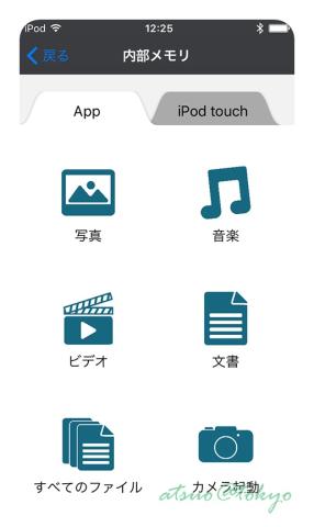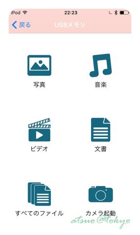 メインメニューで「USBメモリ」をタップするとファイル種類のメニューが表示されます。