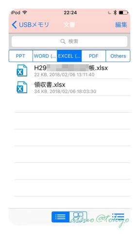 上部に対応するファイル種類のタブがあり、それぞれをタップする事で対応したファイルの一覧が表示されます(上記は EXCELファイル)。