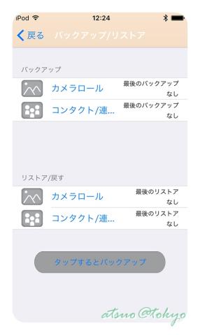 メインメニューで「バックアップ」をタップすると「バックアップ/リストア」メニューが表示されます。