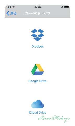メインメニューで「Cloudのドライブ」をタップすると設定にあった 3つのクラウドサービスのアイコンが表示されます。