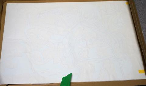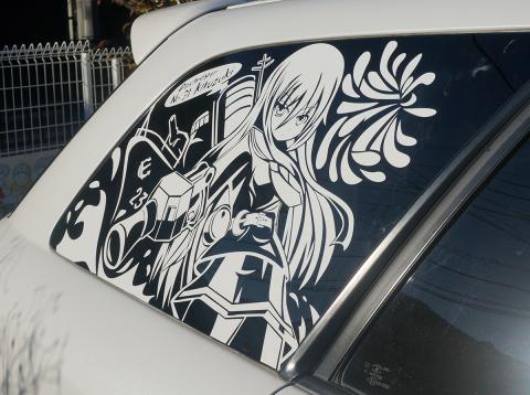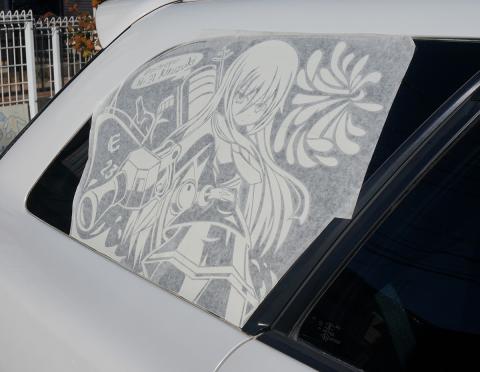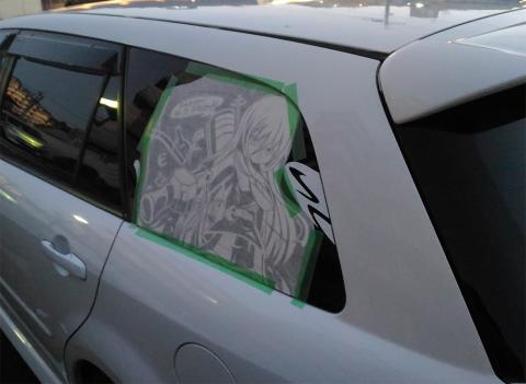 ちなみに元々右側orリアウインドウ用に作った絵柄のままなので、カッティングなことをいいことに左側は切った貼ったの現物合わせレイアウト。キャラクターが乾くまでの時間潰しに元々後で貼るつもりだった左上の花の絵柄を水なしで貼ったが結構うまくいった。けど本体は乾いてない。