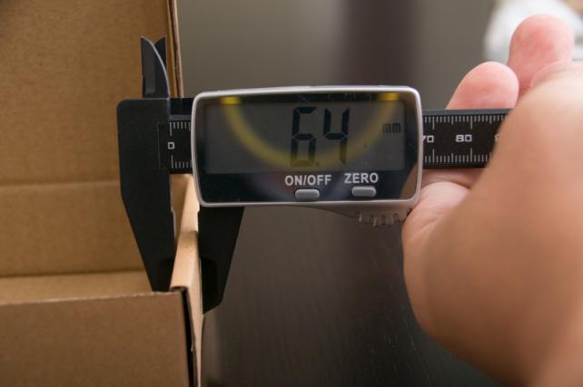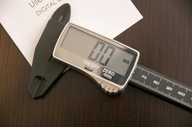 大きい方で外側の厚みを計測します。挟み込んだ厚みの数値がデジタル液晶に表示されるのでわかりやすいですね。最大150mmまで計測できます。バックライトはありません。