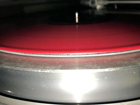 実際にレコード盤を置いてみました。色がわかりやすいように、「Explosive / David Garrett」の赤い盤を選んでみましたが、うっすらとレコード盤とSTS-1との間に見えていることがおわかりいただけるでしょうか。