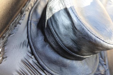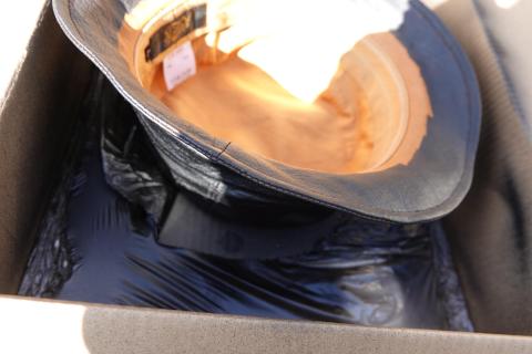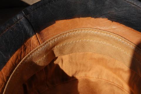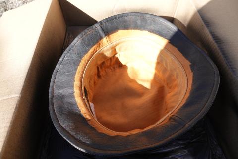 染めてすぐ くしゃくしゃにしたら、バキバキという音と共に染料が剥がれました。つばの裏の部分は、仕上げが違うのか染料を吸い込みなじんでいます。