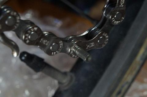 かつては外したピンを再利用するようなこともあったようですが、このピンは再利用はできないことになっています。実際、一度外したピンを再びチェーンの穴に挿入することは無理です。また、穴の径が広がるので同じ箇所での付け外しは1回限りとなっています。