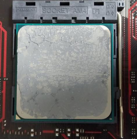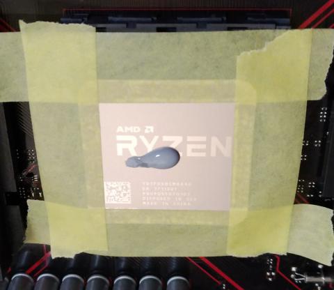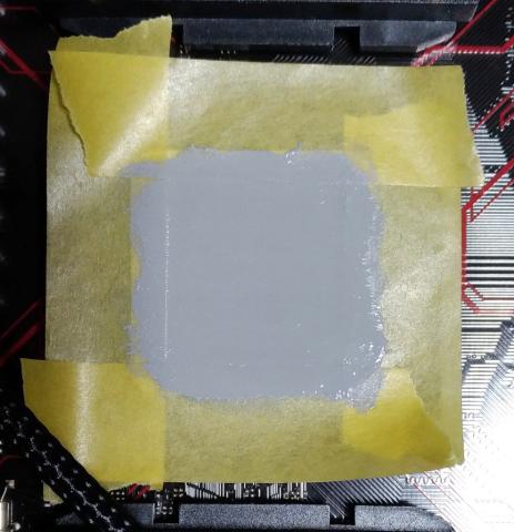 厚みは大体マスキングテープの段差が見えなくなるくらいで、爪でひっかくとCPUの金属部が出現する程度に塗ります。まぁ、この辺りはヘラが良いとか色々あるかと思いますが、塗り広げは指が一番しっくりくるんじゃないかと個人的には思ってます。
