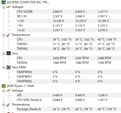 M/Bの報告とCPUの報告の値に違いがあってどちらが正しい情報なのか不明ですが、Max値が40℃となっていました。