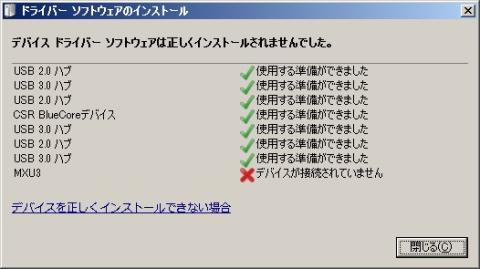 Windows7では、初回接続時にドライバインストールが走って、以下のダイアログが表示されましたがMXU3は失敗していますが、特に問題なくMonterX U3.0Rが動いているため問題ないといえます