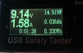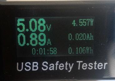 私はQuick Charge2.0対応している物だと思っていましたがよくよく見たらば2.4Aで9V/2Aじゃなかった。2.4AだとiPhone系ですね。とりあえず、電流、電圧を測定してみました