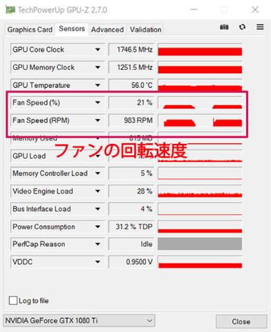 GPU-Zで時系列にファンの回転を拾っても、動いたり止まったりしているのが分かります。下記の画面は、アイドル状態ではなく、HD動画のエンコード中の動作です。