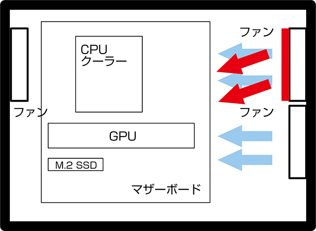 例えば、発熱の多いGPUのプリント基板側に風向きを変えたり、メモリに風が当たるようにしたり、手前下向きにして、GPUを避けながら、マザーボード下部のSSDに風を送る等、色々使えそうです。