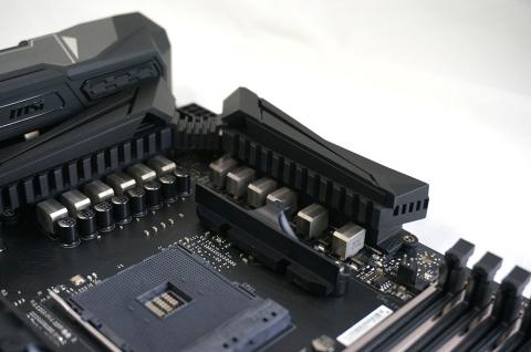 一体デザインのチップセットヒートシンクはロゴLED付き。