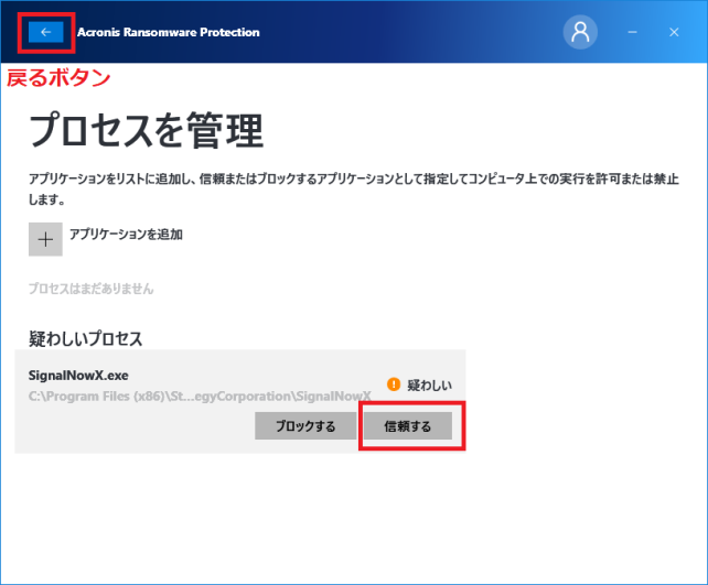 「SignalNowX.exe」緊急地震速報のプログラムが怪しいと言ってますが、信頼しているので「信頼する」ボタンをクリックします、左上には「戻る」ボタンも有ります。