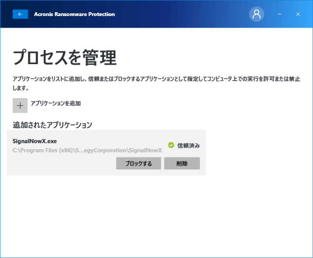 「戻る」ボタンを押し、再度「プロセスを管理」に戻ってきました、「ブロックする」と「削除」ボタンが現れ、間違った時の対応も大丈夫ですね。