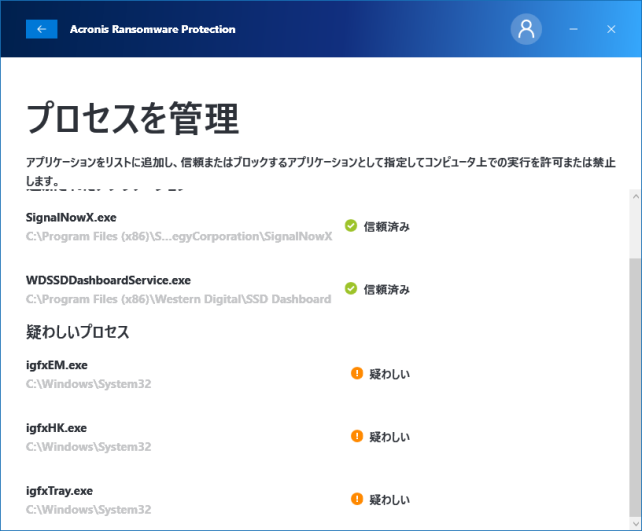 上の方で、怪しいプロセスが3個有りましたが、表示されない状況でしたが、下記は「WDSSDDachboardService.exe」が増えてますが、PCの再起動直後にタスクバーに出てきた「Acronis Ransomware Protection」アイコンをクリックする事で出てこなかった「疑わしいプロセス」が出て来ました。