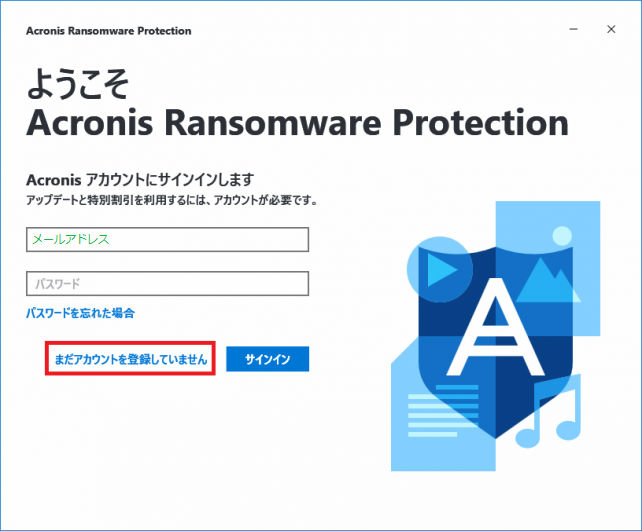 Acronisのアカウントが無い人は「まだアカウントを登録していません」をクリックします、アカウント保有者はメールアドレスとパスワードを入力してインストールは終了です。