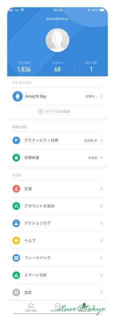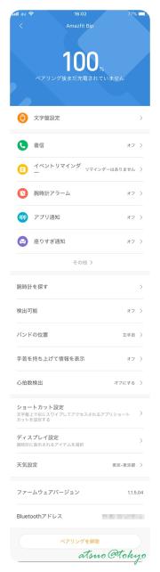 「Mi Fit」アプリで「プロフィール」画面の「マイデバイス」から「Amazfit Bip」を選択する事で各種設定が行えます。