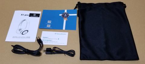 パッケージは本体の他巾着、説明書、充電USBケーブル、AUXケーブル。
