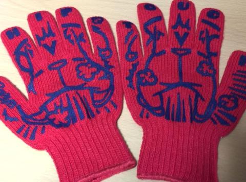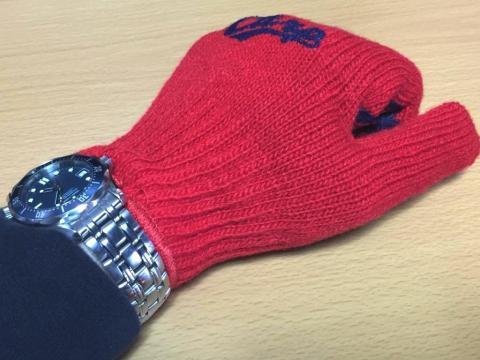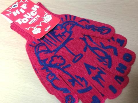 手を叩けば、ヒップタッチができる赤い軍手です。