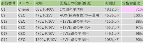 アルミ電解コンデンサの寿命は、メーカーのカタログなどでは初期値から-20%というものが多いのですが、今回は初期値がわからないので単純に定格容量の-20%を下回ったものを寿命と判断しました。