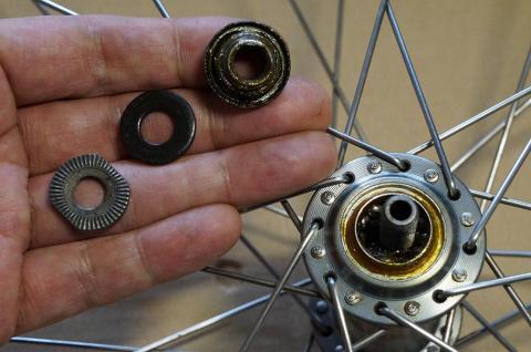 このあと、グリスを充填して、ベアリングを並べ、ハブのシャフトと玉押しをセットしましたが、要領が悪く手がグリスだらけになって、写真が撮れませんでした。