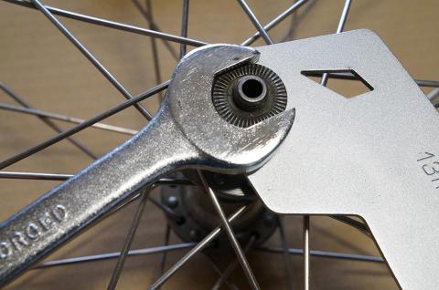 スパナ(17mm)とハブスパナ(前輪 13mm、後輪 15mm)でハブのネジを外します。