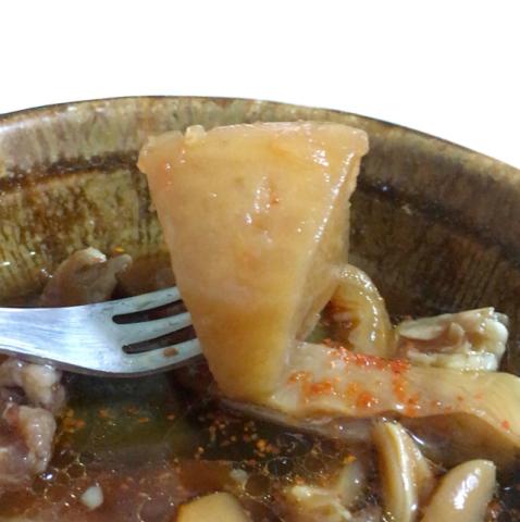 コラーゲンたっぷりの牛すじを柔らかく煮込み、大根・こんにゃくと一緒に、甘味を抑えた「すき焼き風」の味付けをしています。