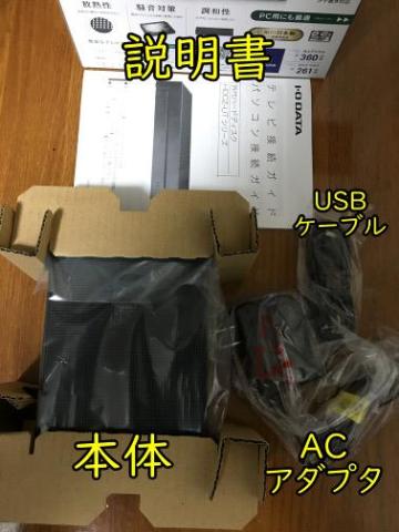 中にはディスク装置本体、説明書、ACアダプタ、USBケーブルが入っています。