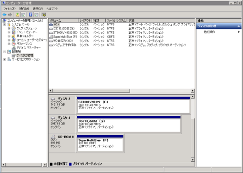 名前の通り「DS713_iSCSI」というボリュームラベルのGドライブが、iSCSIで接続したNAS上のディスク領域(ここではサイズに2047GBを指定)です。Windowsのディスクの管理では、ローカル接続のHDDと全く同様に見えています。
