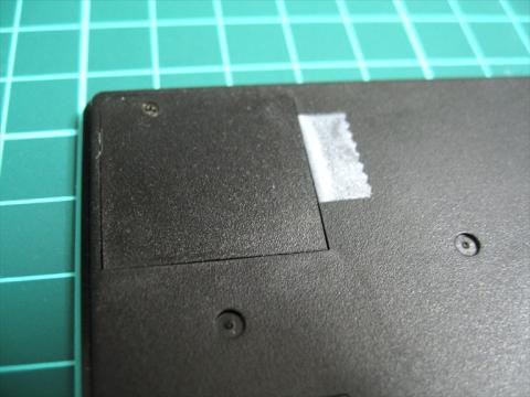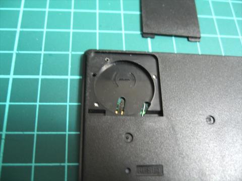 事前に計算機の電極がどうなっているか見ていたので使えるんじゃないかと思った次第です 試行錯誤の結果、電池を電極へ寄せてテープで固定、電池蓋を閉めて完了です。