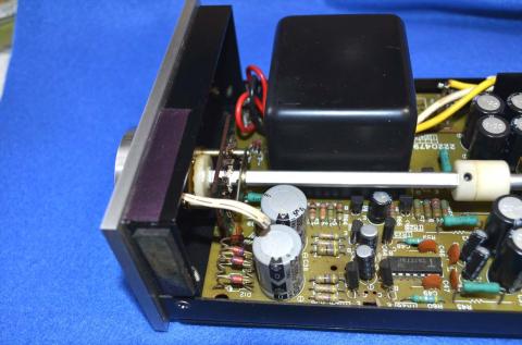中央のリレーはミューティング解除(NC) , 前面のツマミをセンターから左右に切り替えたとき電源が入り、赤いLEDが即点灯し、音は7秒位後リレーが入り音が出ます。