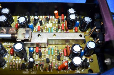 左側は電源トランス、電源部、中央は±15Vデカップリングコンデンサー、ミューティングリレー、右側は入力信号系 左右独立回路