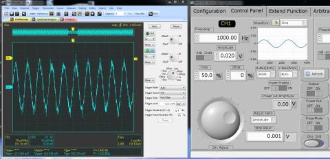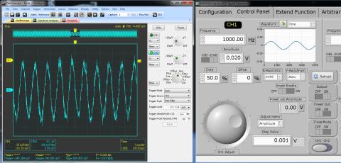 入力信号 1KHz, 0.02V(20mV) 微弱信号だとノイズに邪魔されます。