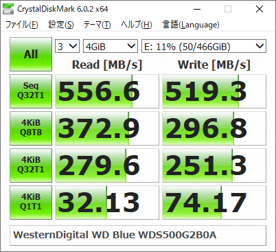以前掲載した、過去購入分のWDS500G2B0Aと、枝番も含めて同一型番ということで、ベンチマークテストの測定結果は以前のものをそのまま流用します。