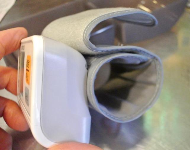 あとは測定・停止ボタンを一度押すだけ。 前述のカフに空気が送り込まれます。
