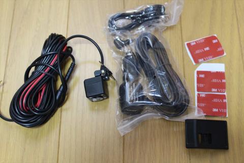 後方カメラ、シガーチャージャー、マウント、粘着テープが付属しています。