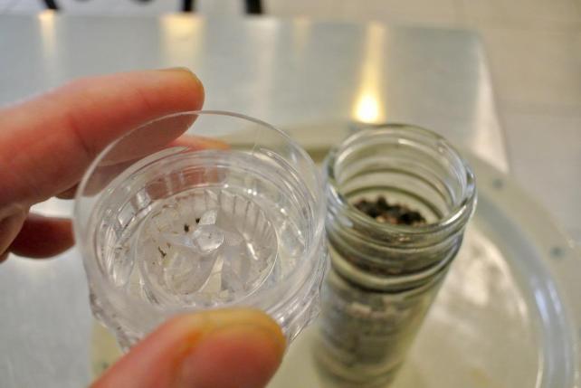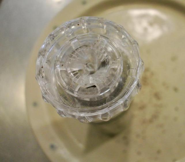 それなりの手応えを感じつつ、ミル部を左右に回し戻しすると、このように粒胡椒が粉砕されます。
