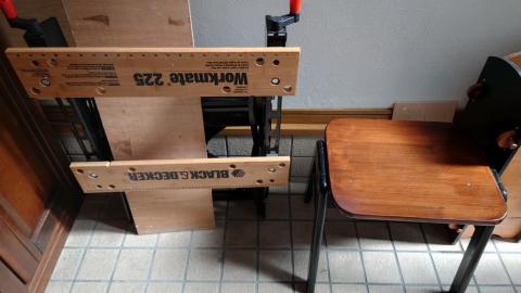それまでは折り畳み式のデスクでしたので、不安定で怖かったのですが足でしっかり押さえることも可能ですので多少のDIYは可能になりました。