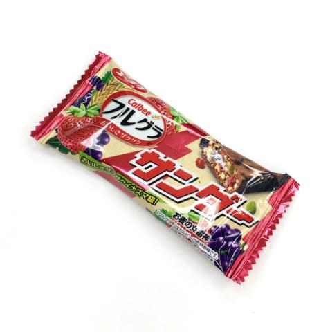 カルビー社のグラノーラと、2種類のフルーツを組み合わせたチョコバーなんです。