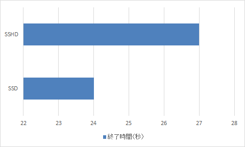 こちらは明確な差がついており、SSHDで27秒かかったところがSSDだと24秒と3秒の