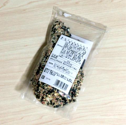 原材料名: ごま、粒状大豆たん白、ぶどう糖、でん粉、砂糖、じゃがいも、食塩、醤油、乳糖、のり、発酵調味料、鰹節、アカムツ、ねぎ、デキストリン、トマト、香辛料、野菜エキス、蛋白加水分解物、加工でん粉、調味料(アミノ酸等)、着色料(カラメル、カロチロイド、ラック)、甘味料(カンゾウ、ステビア、アセルファムK)、酸化防止剤(V.E)(原材料の一部に小麦、さば、ゼラチンを含む)