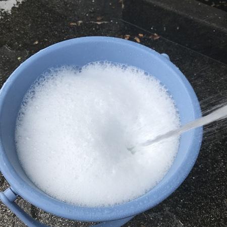 ボトルをよく振った後に適量をバケツに投入。シャワーで泡立てた時はこんな感じ。