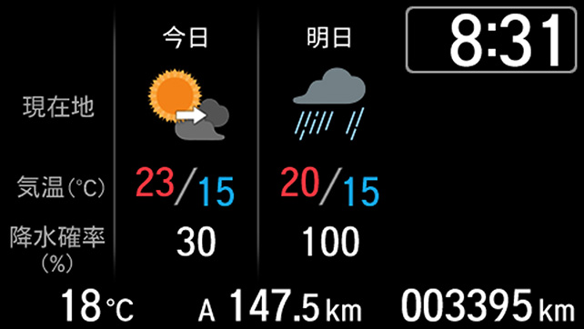 また、天気予報もインターナビ経由で受信できるため、ナビゲーション画面や、クラスタパネル内のマルチインフォメーションディスプレイに天気予報を表示させることができます。