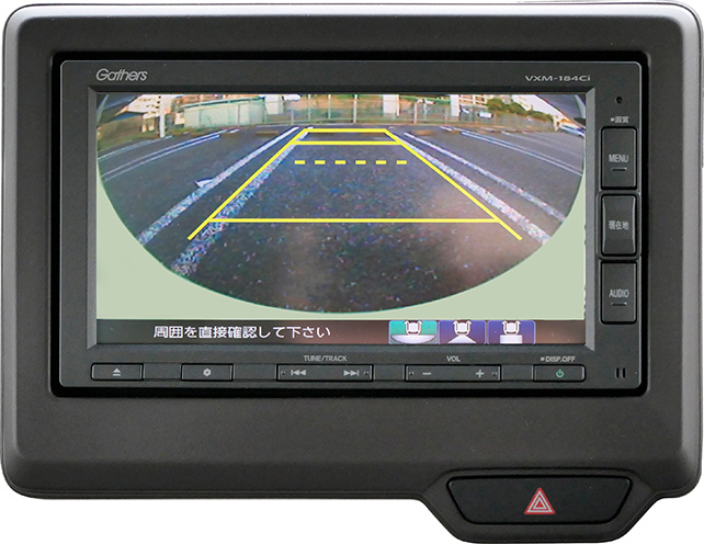 シフトレバーと連動してカーナビゲーション画面にリアカメラの撮影画像を表示させ、更に、リアカメラの画角(ワイド/ノーマル)変更や、上方からの俯瞰表示に切り替えられたりできるようになります。また、リアカメラ表示時に表示されるガイドラインも、リアハッチを全開できるラインが表示されたりしますので、自分で細かな設定をしなくても良く、私のようなものぐさ者にはうってつけです。