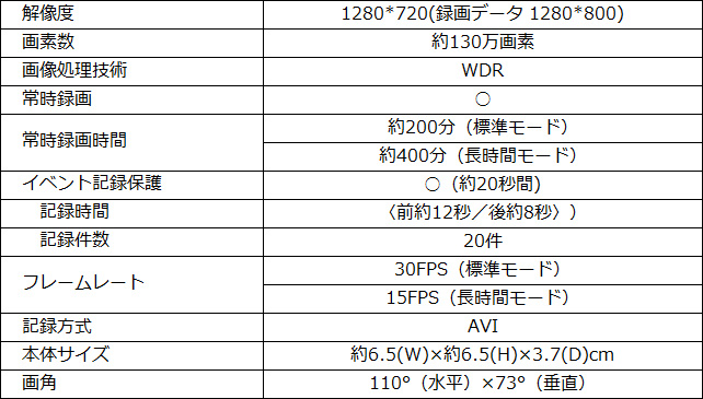ファイル自体は、AVIファイルで、1280*800ドット 記録時間が2分間で58MB(標準録画モード:30fps) 映像が3,798Kbps 音声が16bit モノラル128kbpsで記録されます。
